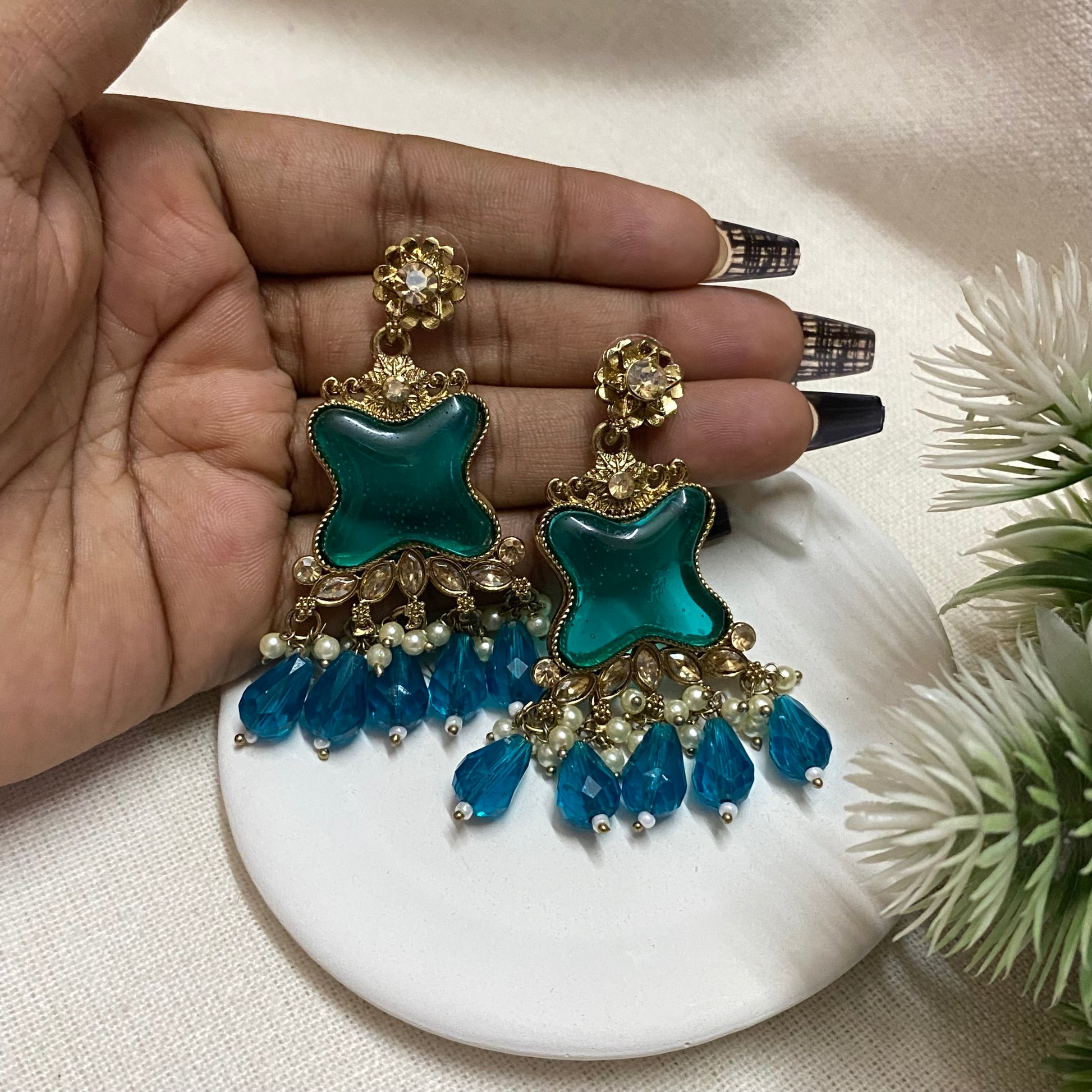 Expertly crafted with a mix of green and blue accents, this Golden heavy jhumka is a must-have for any fashion-forward individual. The intricate design and luxurious gold finish make it a versatile accessory that adds a touch of elegance to any outfit. Elevate your style with this stunning statement piece.