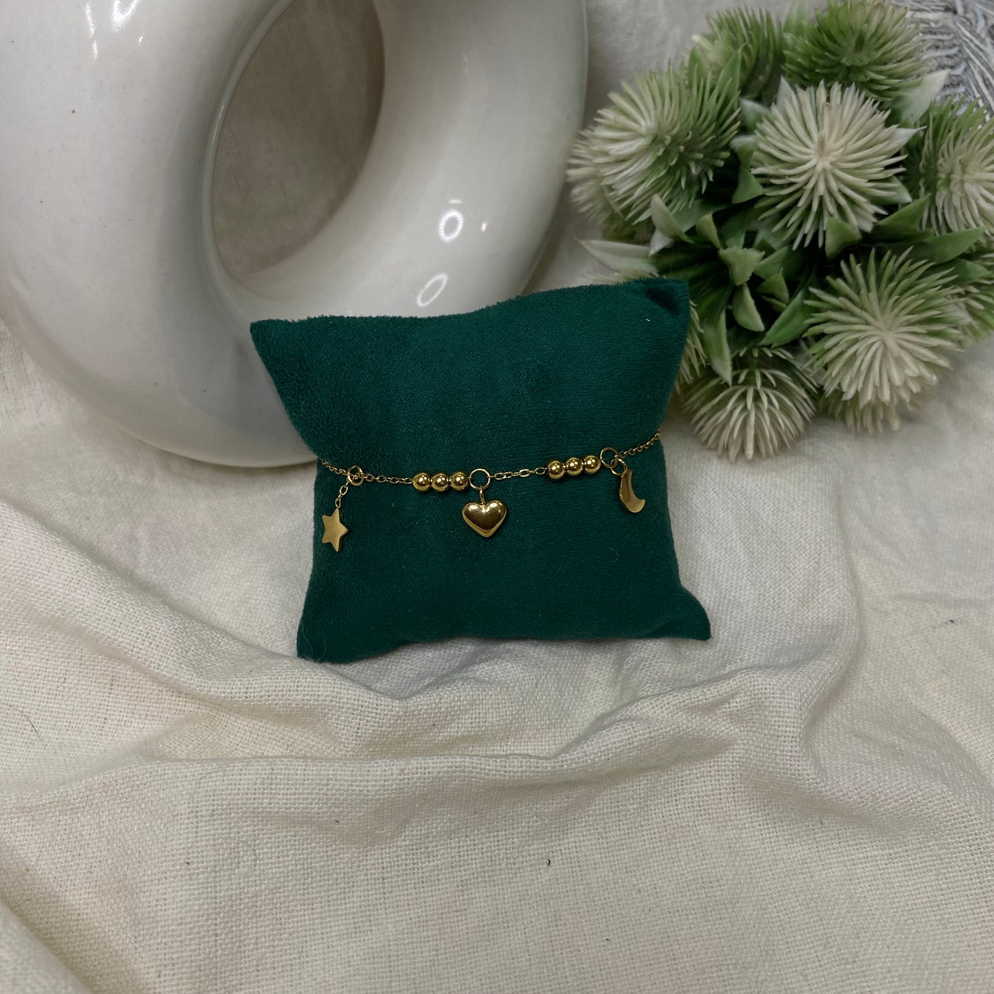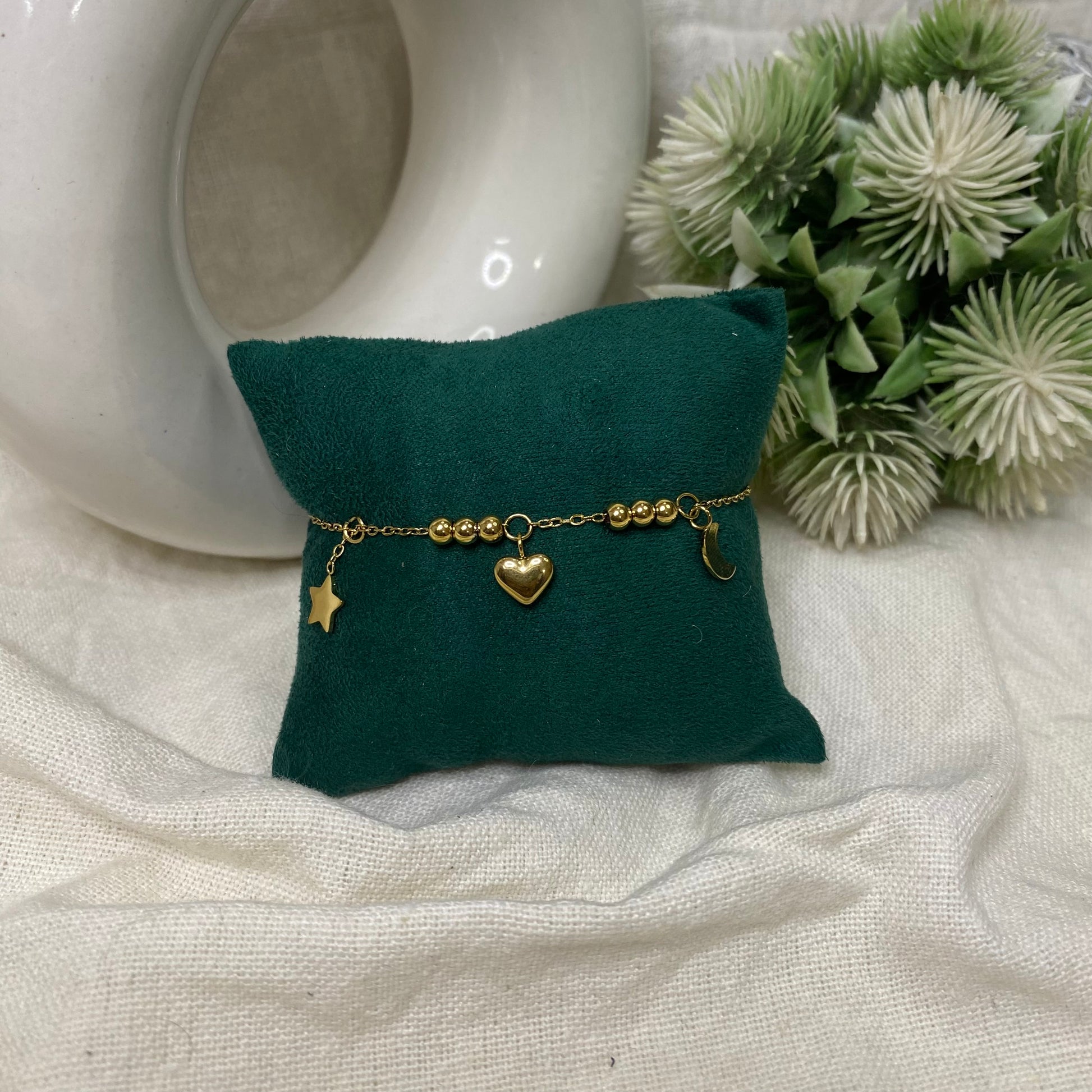 This Moon & Star Golden Charm Bracelet is not only aesthetically stunning, but also boasts 6 months of anti-tarnish protection. Rest assured that your bracelet will maintain its golden shine for months to come, while adding a touch of celestial beauty to any outfit. Covered by a 6-month warranty for your peace of mind.