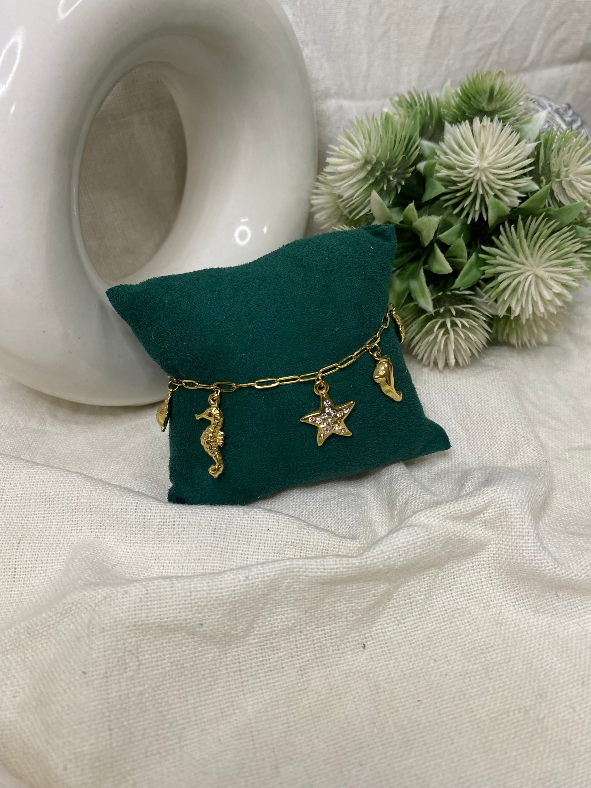 Experience the beauty of the ocean with our Ocean Love golden Charm Bracelet. This anti-tarnish bracelet features intricate sea horse, star fish, and sea shell charms. With 6 months of warranty, you can enjoy this bracelet worry-free. Perfect for ocean lovers, this bracelet is a must-have for any jewelry collection.
