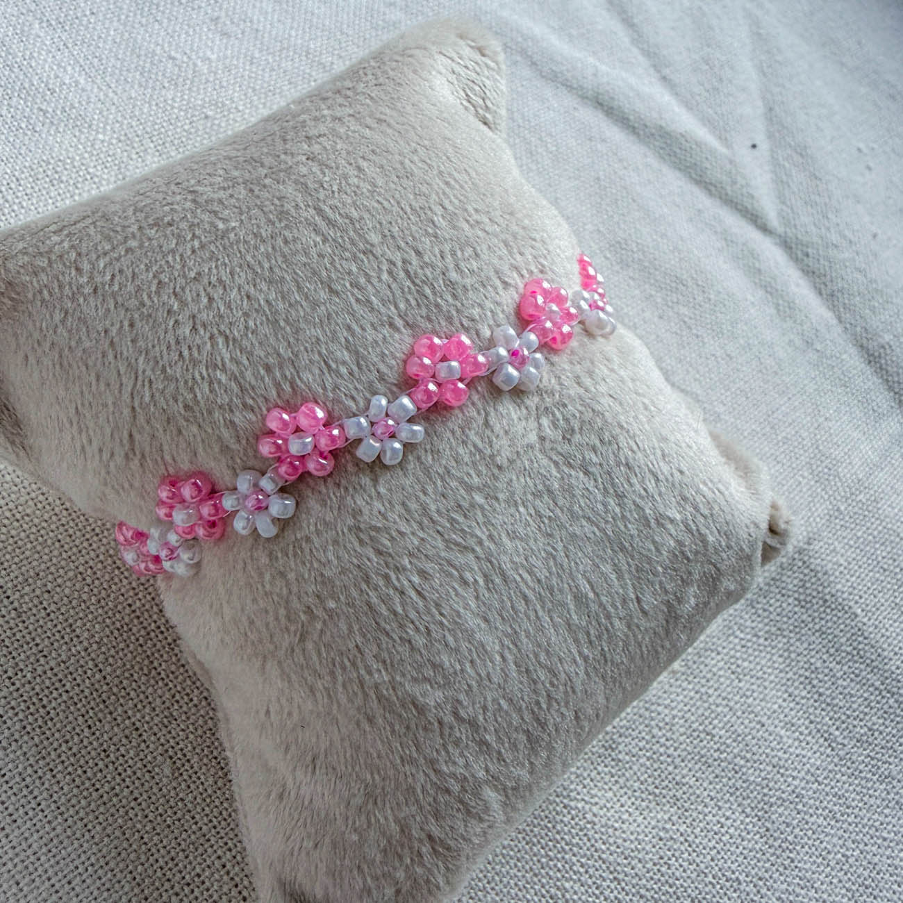 Each bracelet is carefully handmade using high-quality beads and durable findings to ensure long-lasting wear. The soft pink floral details paired with subtle gold accents create a balanced, eye-catching design that complements both minimal and statement styles.
